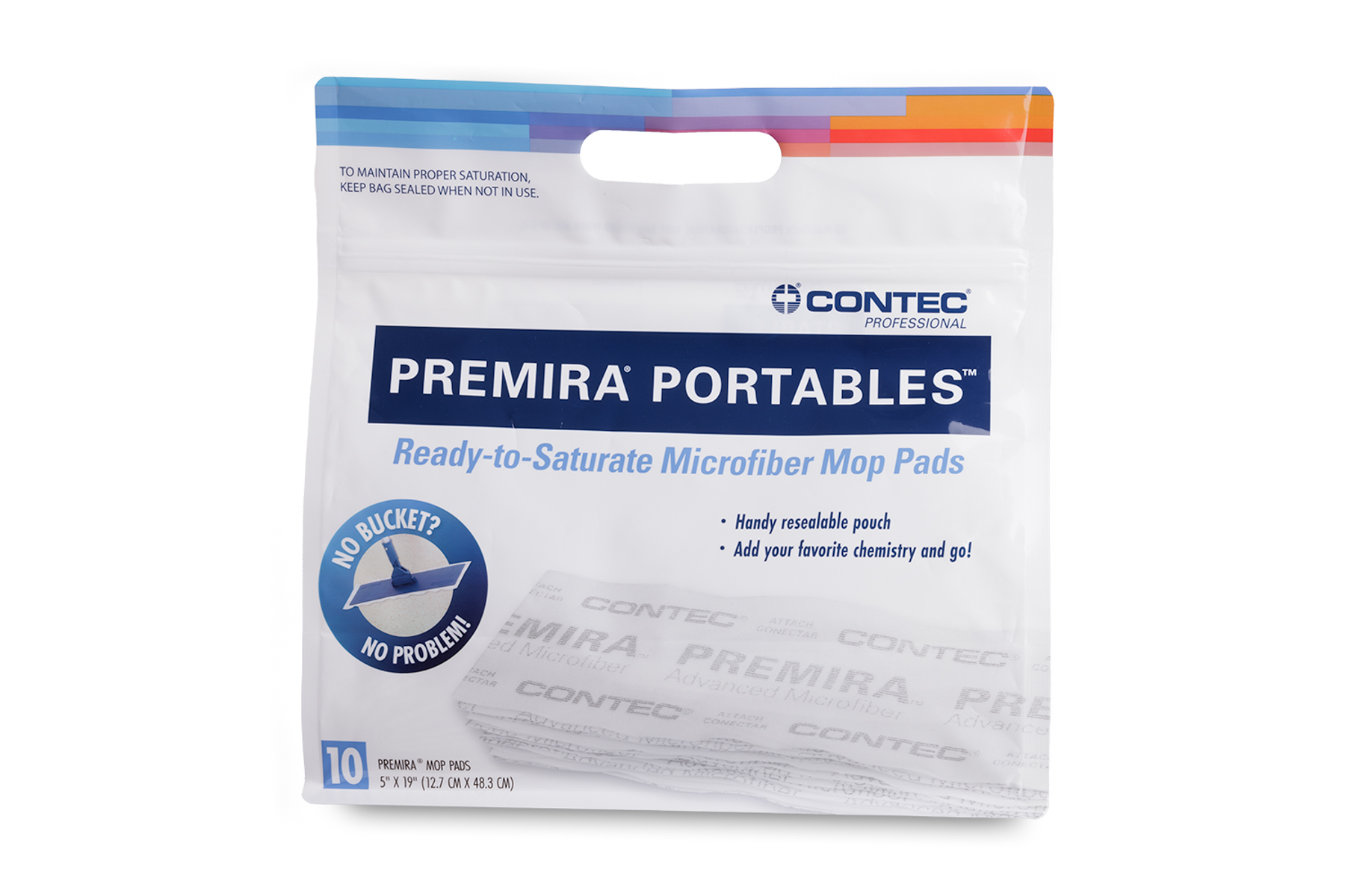 Premira® Portables™ bring the power of Contec® Professional microfiber into a lightweight, convenient package perfect for vivarium and bio-safety cabinet cleaning. Each resealable pouch contains dry Premira mop pads that can be saturated on demand—simply pour your preferred cleaning solution directly into the pouch.